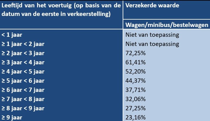 De limiet van de verzekerde waarde blijft vastgesteld op 100.000 euro, ongeacht of het voertuig verzekerd is op basis van de cataloguswaarde of de factuurwaarde. Voor voertuigen verzekerd op cataloguswaarde zal voortaan echter een waardevermindering worden toegepast, afhankelijk van de leeftijd van het voertuig, volgens onderstaande tabel: