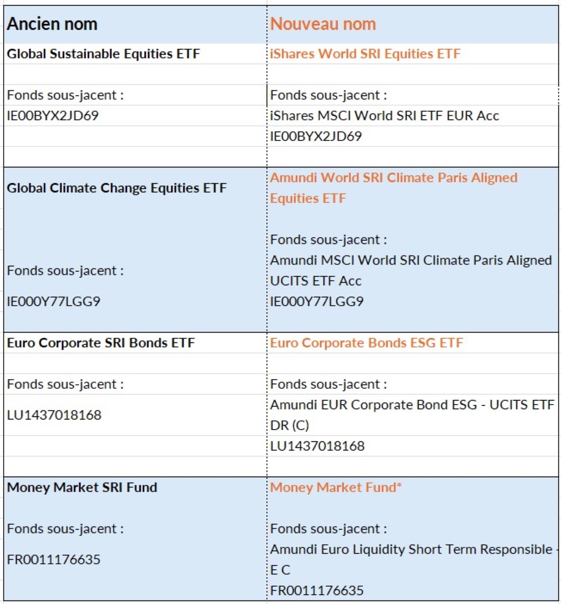 Les fonds Life suivants portent désormais un nouveau nom :